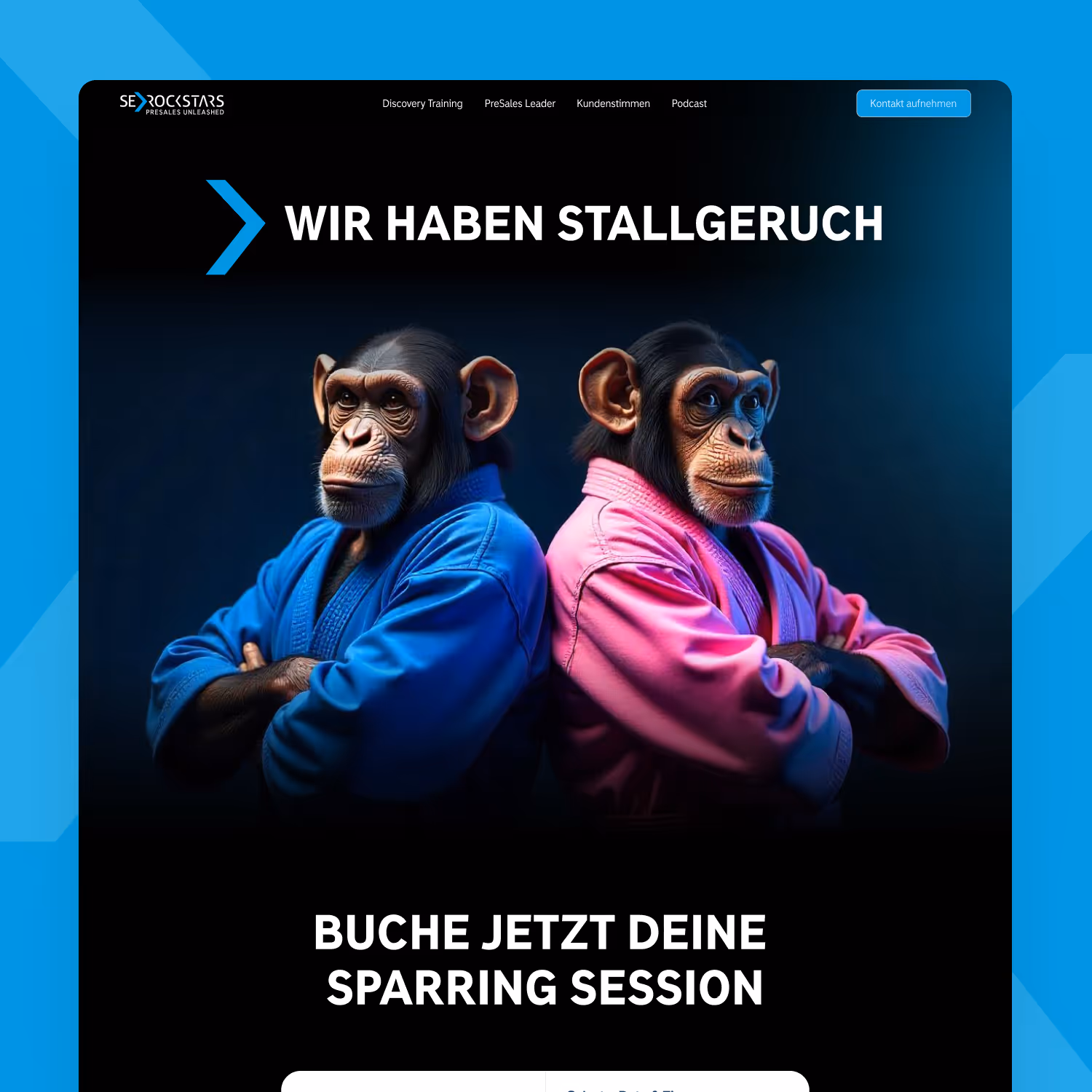 Mit dem Relaunch hat SE Rockstars nun eine Website, die den Kern ihres Angebots klar, mutig und einprägsam präsentiert – von der kraftvollen Bildwelt mit Affen bis zur strukturierten Darstellung des „Discovery Dojo“. Alle Inhalte und Module lassen sich jetzt von Tim und Jan selbstständig pflegen, sodass neue Angebote, Termine oder Ressourcen ohne externe Hilfe online gehen können.