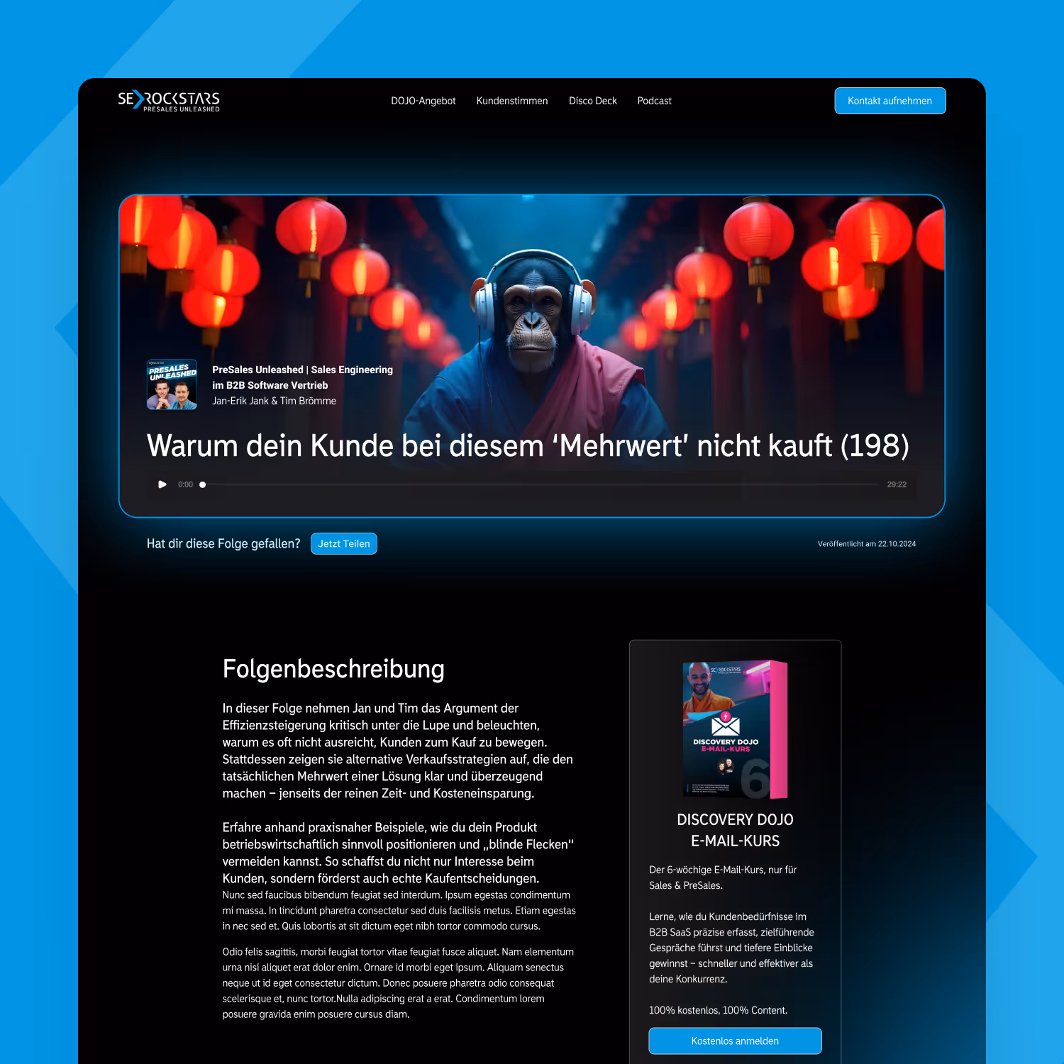 Tim und Jan von SE Rockstars überzeugen mit ihrem transformativen „Discovery Dojo“ – einem Programm, das PreSales-Profis auf ein neues Level hebt. Die Qualität ihrer Arbeit zeigt sich nicht nur an namhaften Kunden, sondern auch an einer beeindruckend hohen Weiterempfehlungsrate.