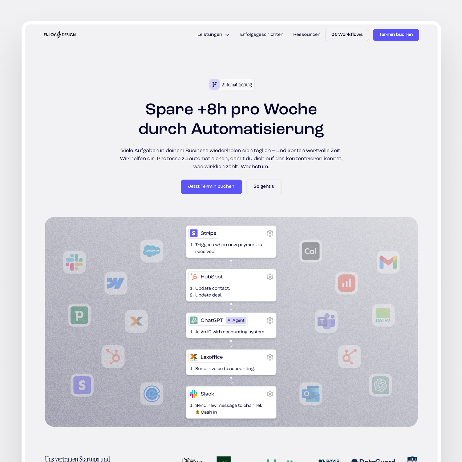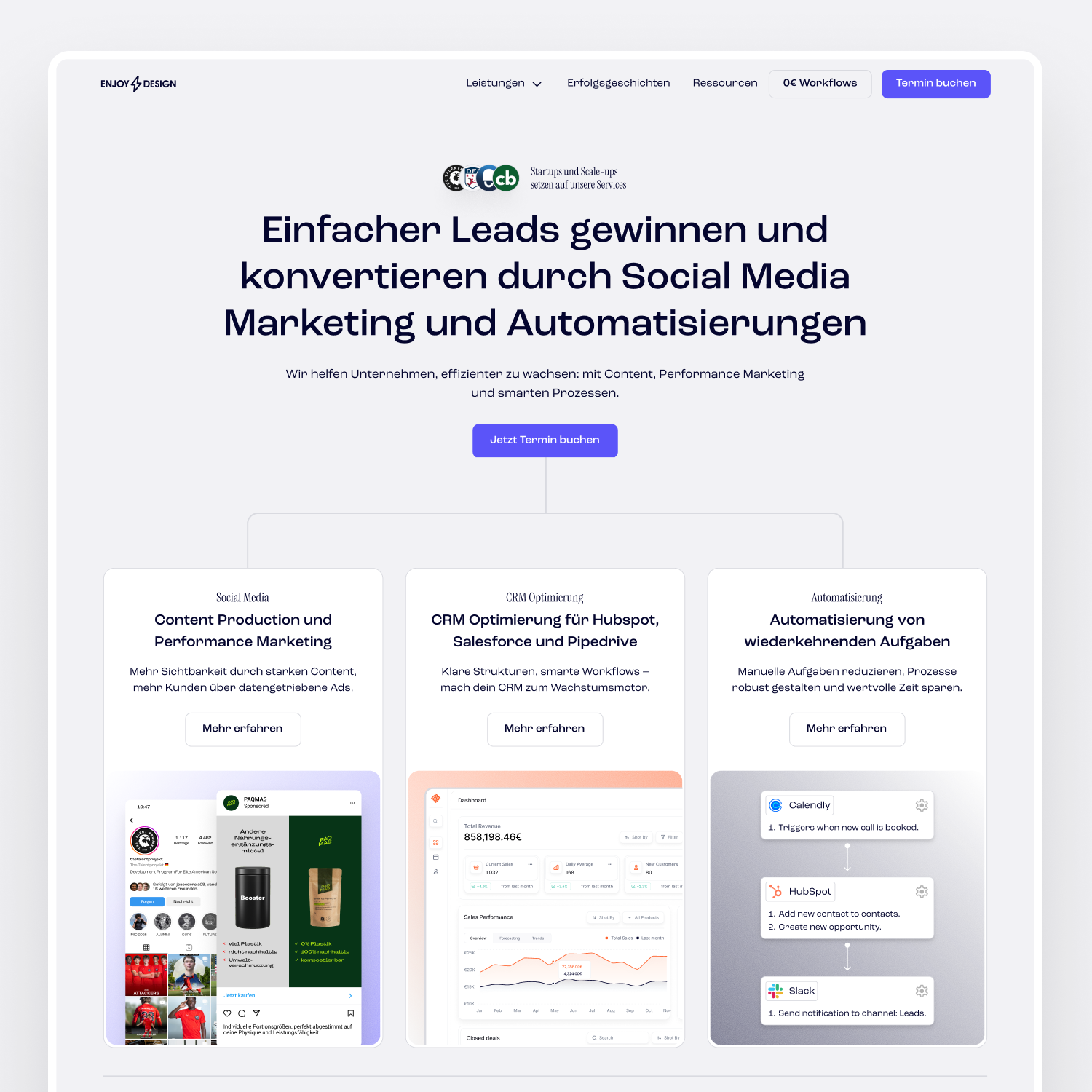 - Sales Calls sind konkreter, weil Interessenten schon vorab verstehen, dass Marketing, CRM und Automatisierungen bei enjoydesign keine getrennten Disziplinen sind.